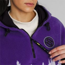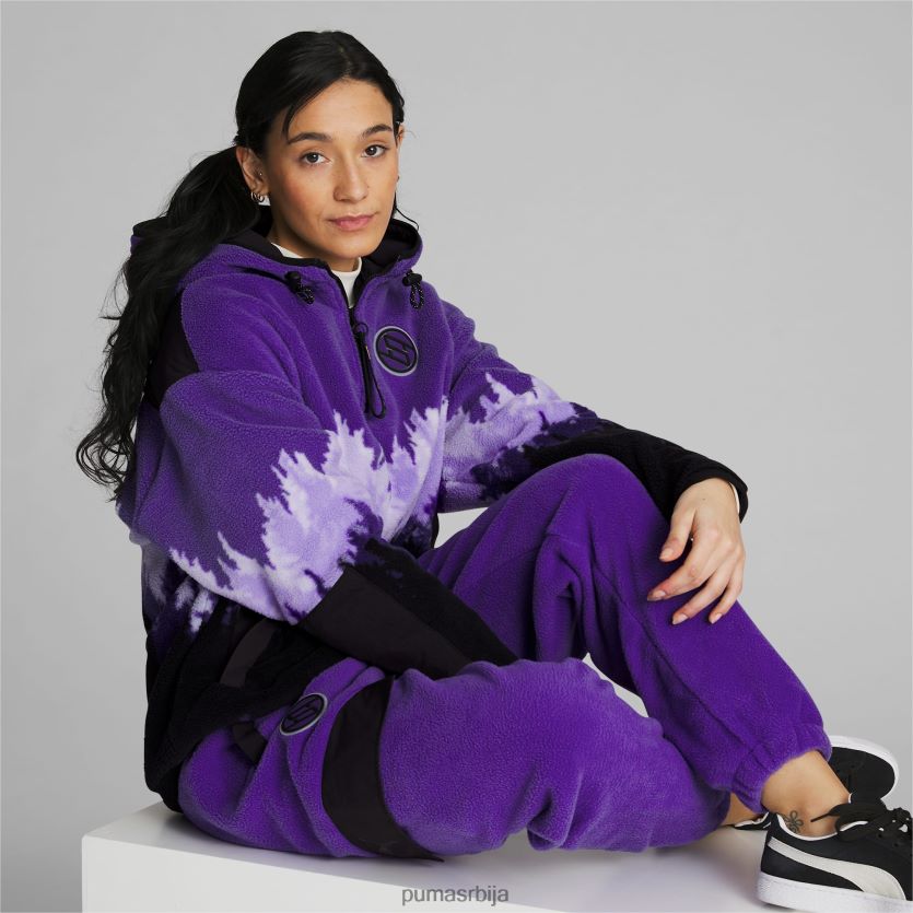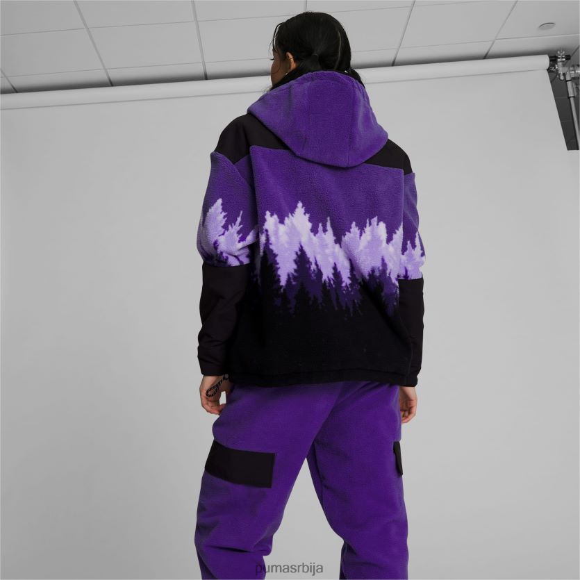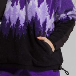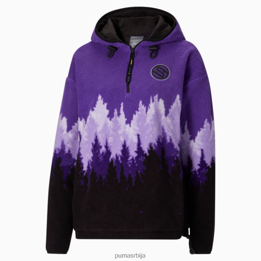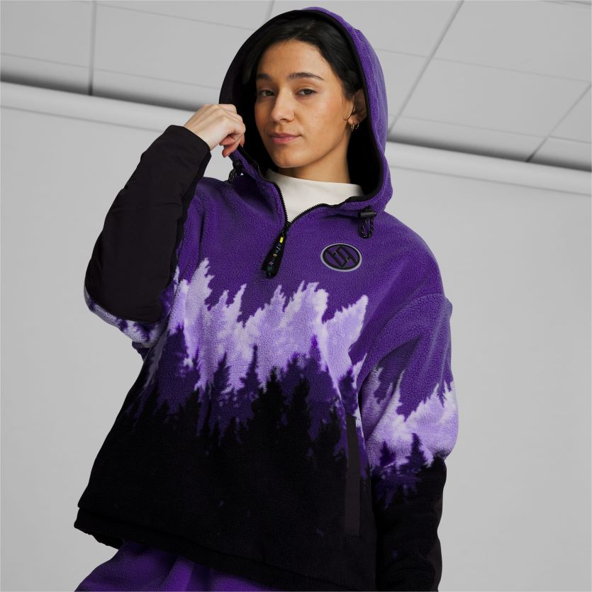 од плишаног поларног флиса, јакна за одрживост Стевие к има љубичасти градирани отисак дрвета инспирисан прелепим моунт раиниер. контрастна црна на јарму и полеђини рукава додаје естетику колор блокова из 90-их, док рајсфершлус украшени симболима, амблем колекције Бреанна Стеварт и репетитивни логотип пума мачке служе као узвишени акценти. џепови за руке и капуљача и поруб на преклоп дају перформансе овом пуловеру инспирисаном планинарењем.